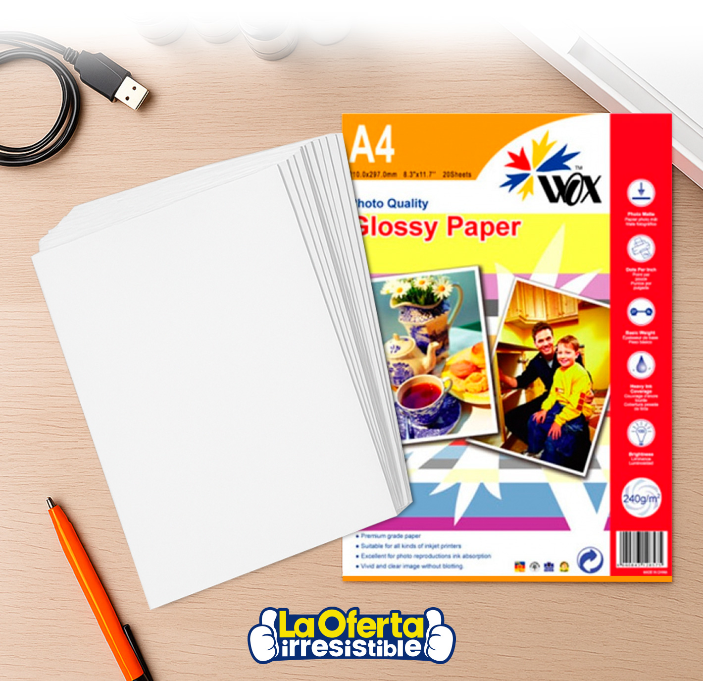 Disfrutá de impresiones de alta calidad con este paquete de 20 hojas de papel fotográfico A4 para impresoras Inkjet. Su terminación brillante de una sola cara realza los colores y ofrece un acabado profesional en cada imagen. Con un gramaje medio de 240gr, garantiza excelente resistencia y durabilidad, ideal para fotografías, presentaciones o materiales creativos. Además, su secado rápido evita manchas, brindando impresiones nítidas, vibrantes y de aspecto profesional en todo momento.Disponible en: