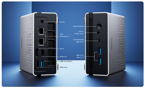HDMI 2.0 / Display Port 1.2 / USB Tipo C (Full-function USB 4.0) / 3 USB-A 3.2 Gen2 / USB-A 2.0 / 2 RJ45 2.5G / Combo audio Jack 3.5mm