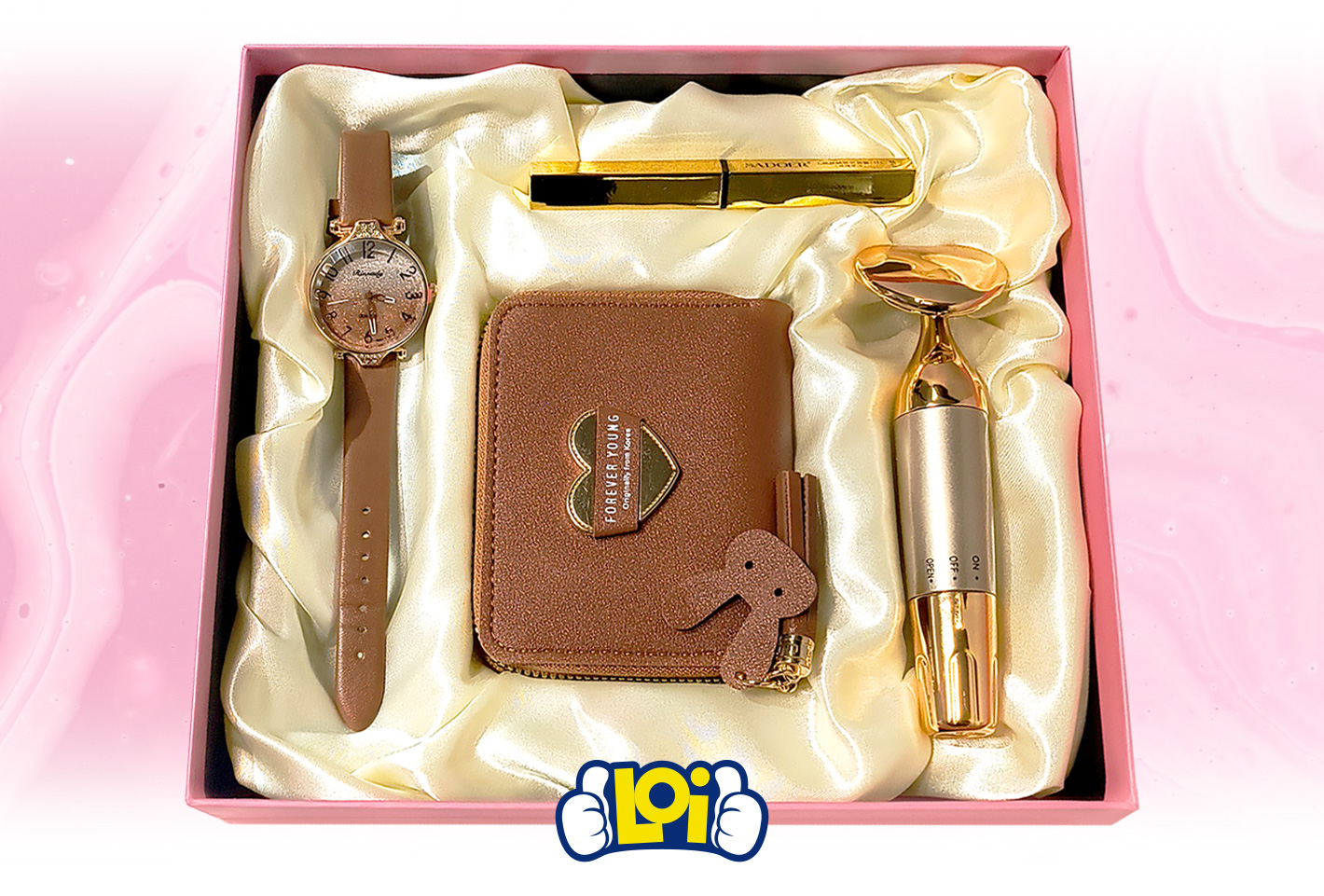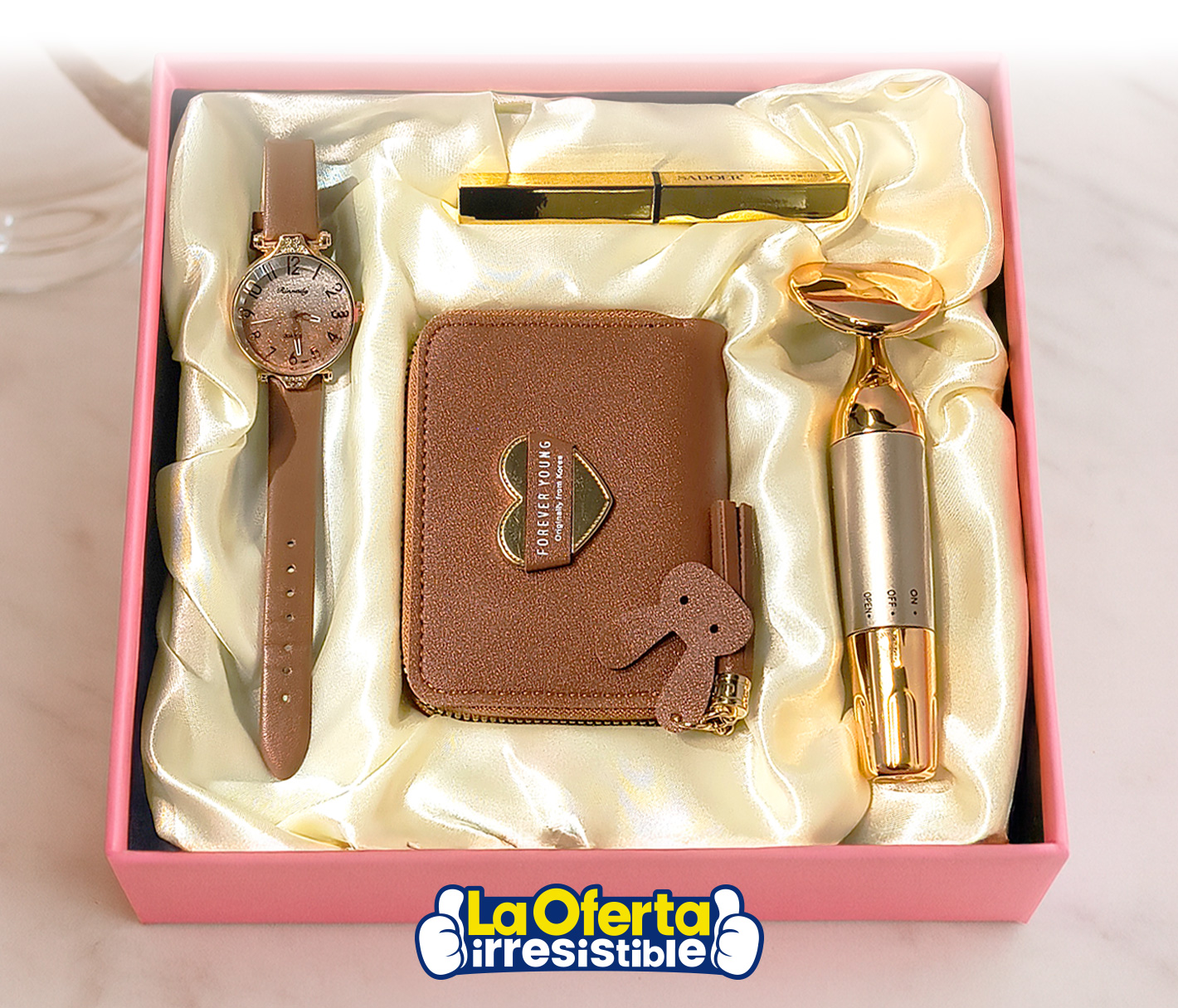 Kit Regalo Cofre con Reloj Analógico, Billetera, Masajeador Facial y Labial
