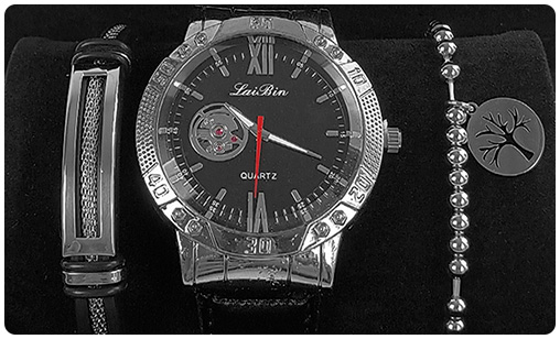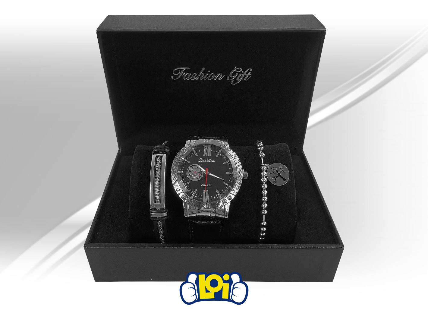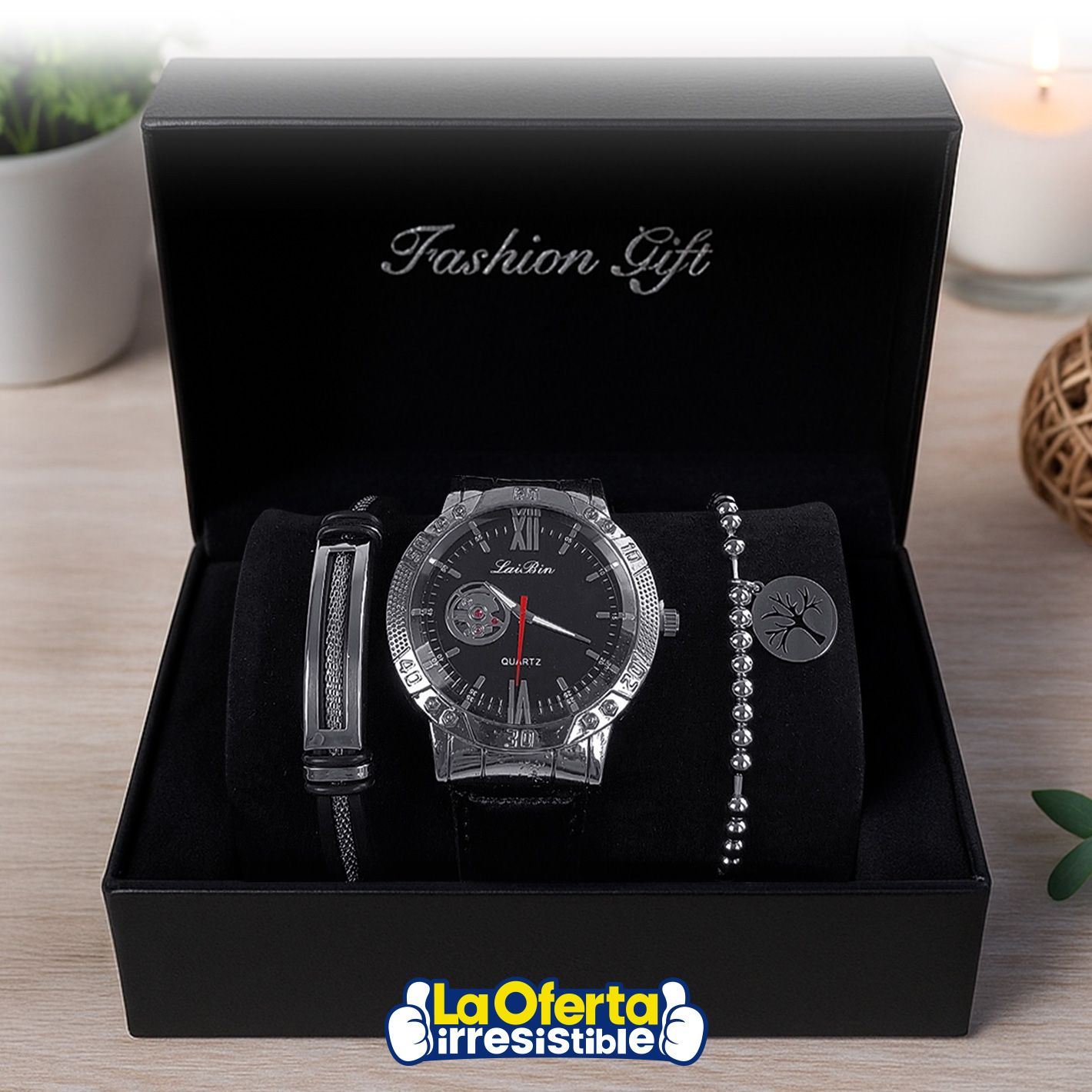 Descubrí la elegancia y el estilo con este exclusivo Combo de Reloj Analógico, que incluye una sofisticada caja de presentación ideal para regalar. El reloj, de diseño moderno y refinado, combina una estructura de acero de alta calidad con una correa de cuero PU suave al tacto y resistente, asegurada con un cierre tipo hebilla clásico. Su movimiento de cuarzo garantiza precisión y confiabilidad, mientras que su resistencia al agua lo hace perfecto para el uso diario. Completan el conjunto una pulsera de acero pulido y un brazalete que mezcla cuero y acero, aportando un toque distintivo y masculino que realza cualquier look. Este set es la combinación perfecta entre funcionalidad y distinción.Podés canjear este artículo usando tus Metros OCA