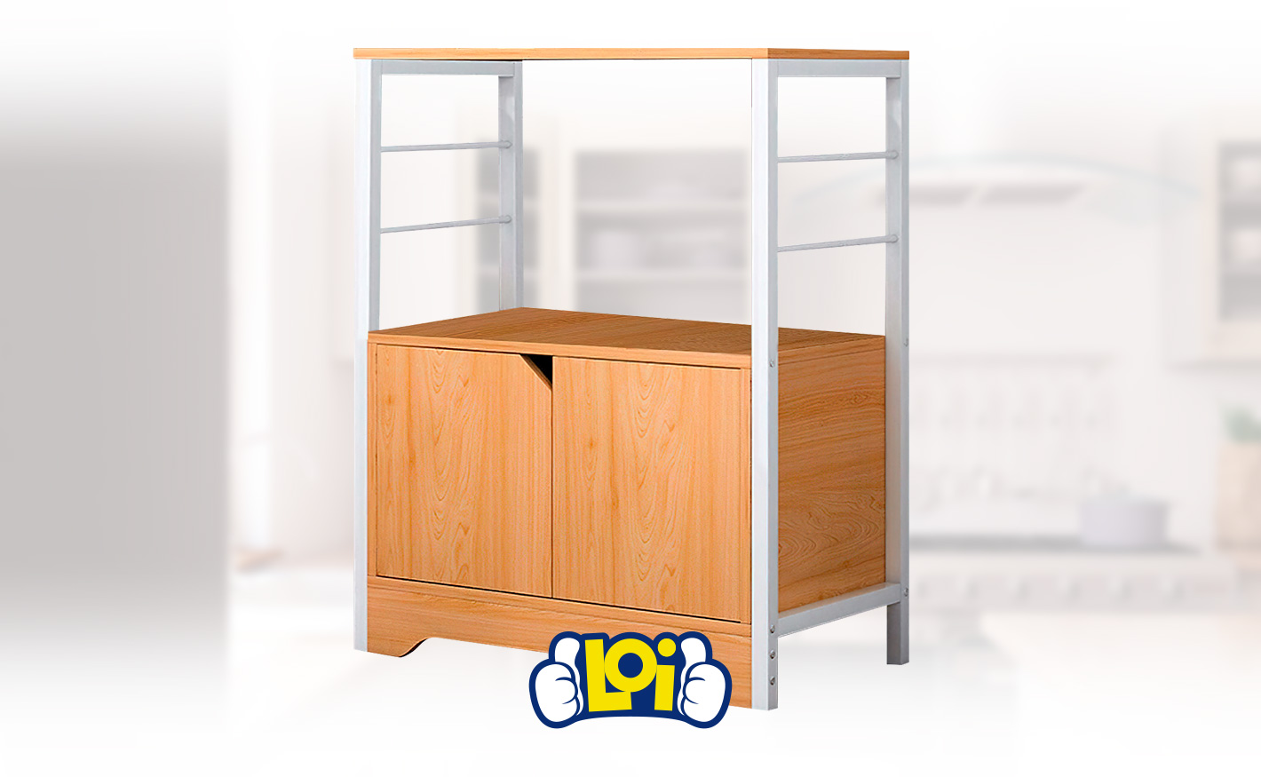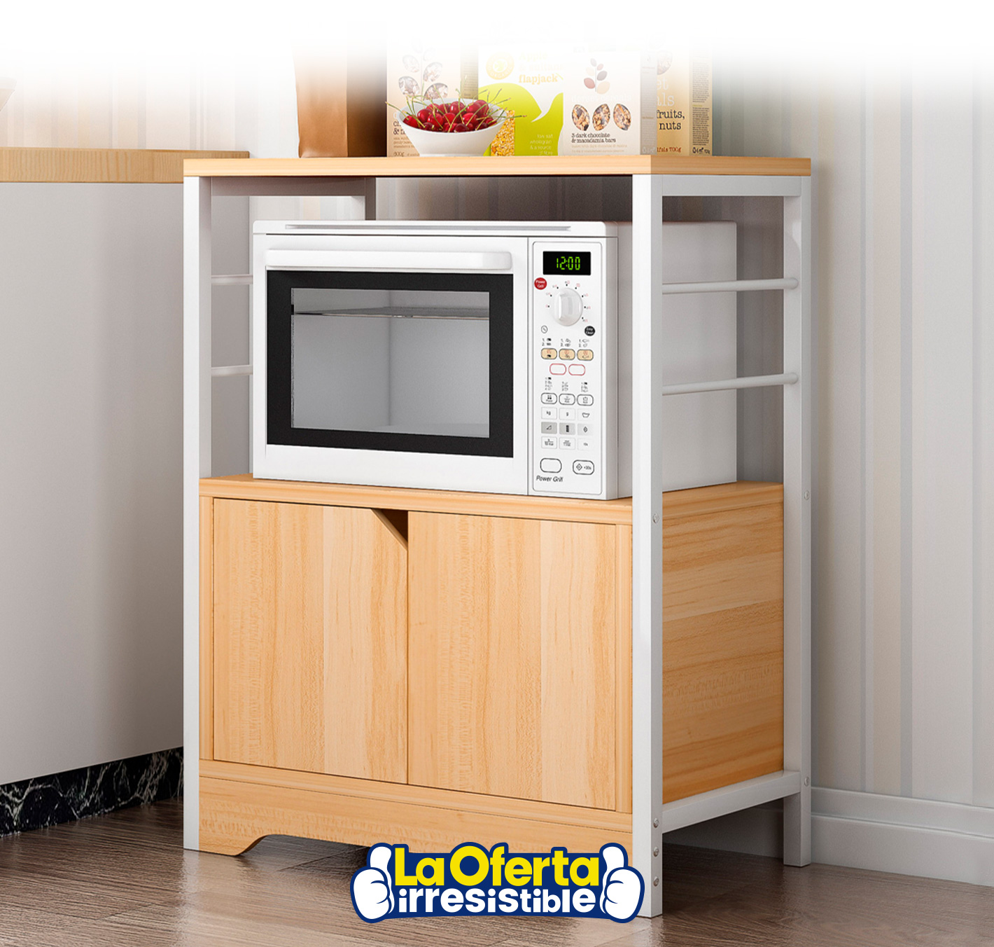 Este rack multiuso es ideal para sumarle estilo y funcionalidad a tu cocina. Cuenta con un diseño espacioso con un gran estante para colocar un microondas si así lo deseás, además de un estante en la parte superior ideal para organizar cajas de cereales y otros artículos de despensa. En la parte inferior posee dos puertas diseñadas con un pequeño hueco para abrirlas con facilidad sin necesidad de manijas. Este rack ayuda a llevar un mejor orden a tu cocina ocupando poco espacio.