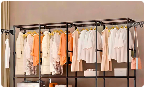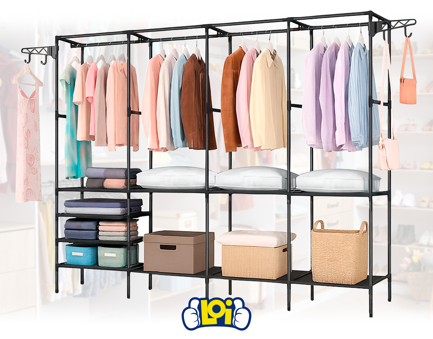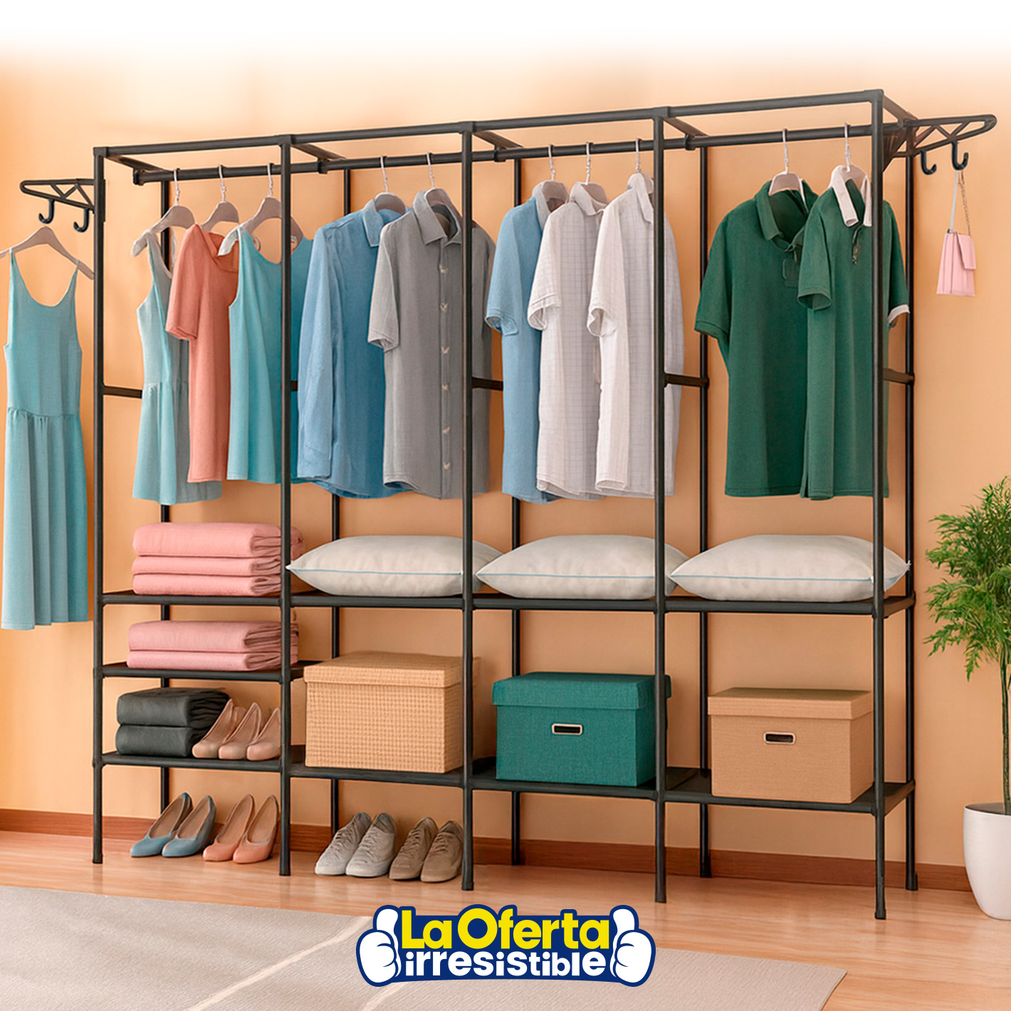 Ropero Metálico DecoTeam, práctico y resistente, con amplio espacio para organizar tu ropa y accesorios. Cuenta con 4 sectores de perchero, 10 estantes y ganchos laterales que te permiten aprovechar al máximo cada rincón. Su estructura de acero duradero y estantes de tela no tejida ofrecen firmeza y fácil limpieza, mientras que su diseño ligero lo hace fácil de trasladar y armar en cualquier ambiente. Ideal para dormitorios, salas de estar, oficinas o lavaderos, este ropero combina funcionalidad y orden en un solo mueble.Podés canjear este artículo usando tus Metros OCA
