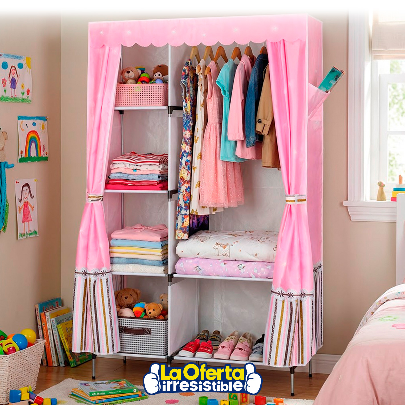 El ropero de tela plegable es una solución práctica y funcional para organizar la ropa y distintos objetos en cualquier ambiente del hogar. Cuenta con un espacio para colgar prendas y seis estantes que ofrecen gran capacidad de almacenamiento, manteniendo todo ordenado y al alcance. Su estructura de metal brinda estabilidad, mientras que la cubierta de tela con cierre reforzado permite abrir y cerrar fácilmente, protegiendo el interior del polvo. Liviano, desmontable y fácil de armar, es ideal para dormitorios, o espacios donde se necesite una opción versátil y de fácil traslado.Disponible en: