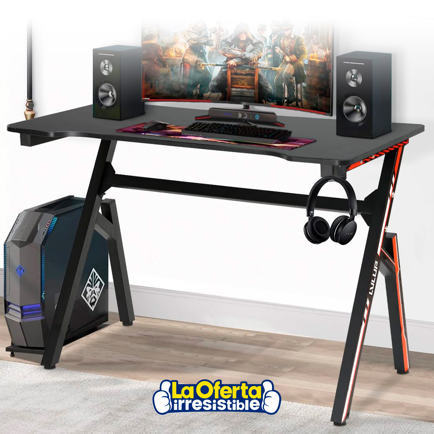Escritorio Gamer LVLUP Kobra 100x70x76cm Madera y Metal con Soporte para Auriculares