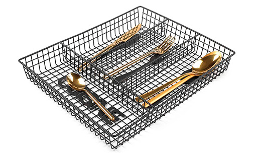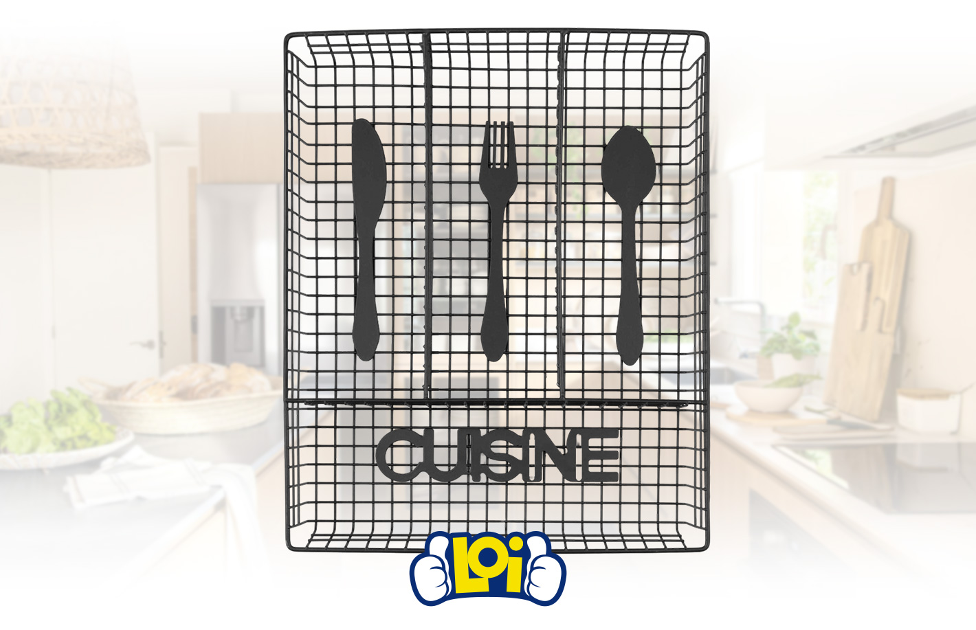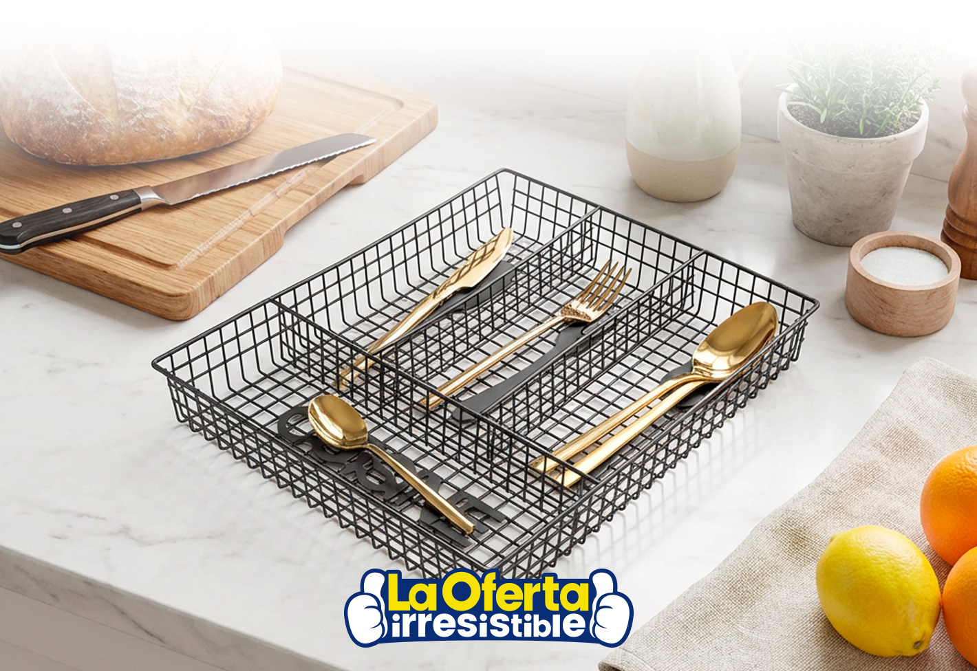 Organizá tus cubiertos con estilo gracias a esta cubiertera tipo bandeja de diseño moderno y minimalista. Cuenta con 4 compartimientos separados que permiten una distribución clara para cuchillos, tenedores y cucharas, mientras que su estructura de metal con rejilla firme y resistente facilita la visualización del contenido. Ideal para apoyar sobre la mesada o guardar dentro de alacenas, suma además un toque decorativo con siluetas recortadas de cubiertos y la palabra “CUISINE”.Podés canjear este artículo usando tus Metros OCA