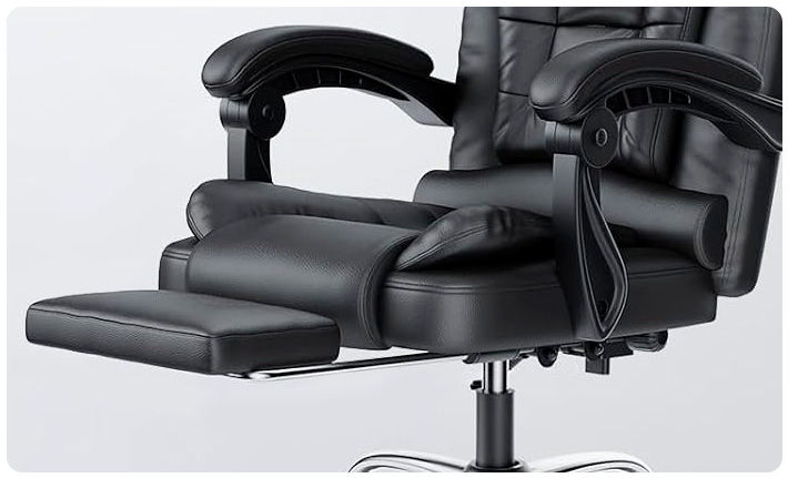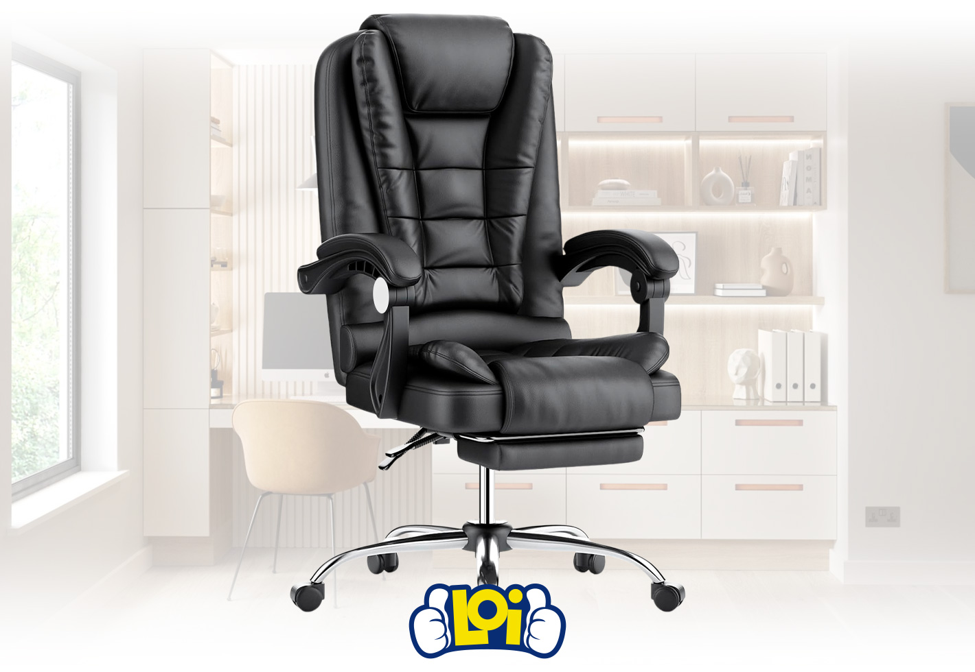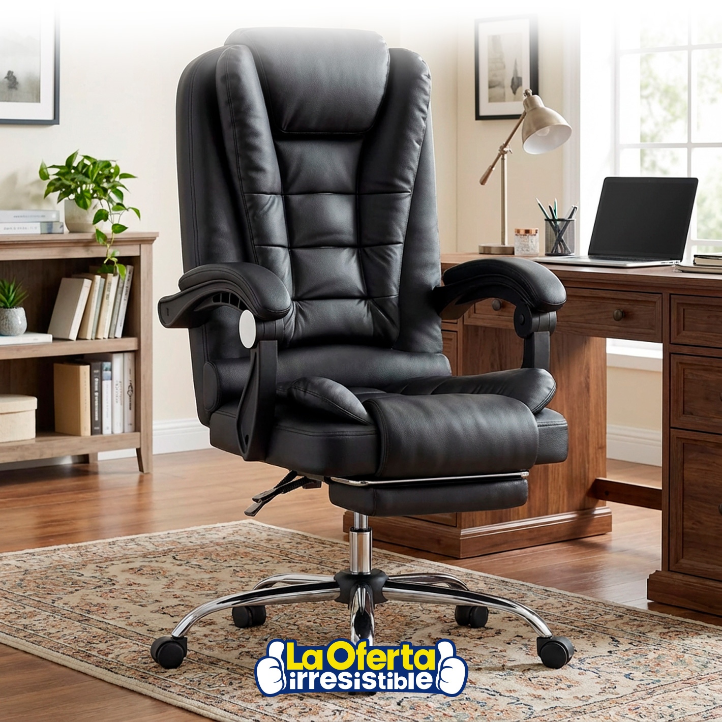 • La Silla Ejecutiva EMPOLi combina diseño ergonómico, confort y funcionalidad para acompañarte durante largas jornadas. Su respaldo alto con cabecera, junto al asiento y respaldo ergonómicos con soporte lumbar, se adaptan a la forma natural del cuerpo, ayudando a mantener una postura correcta y reduciendo la tensión en cuello, hombros y espalda. Fabricada en cuero PU, ofrece un acabado elegante y duradero, con reposabrazos acolchonados, regulación de altura mediante pistón de gas y respaldo reclinable de 90° a 135° con bloqueo. Además, incorpora un reposapiés retráctil ideal para el descanso, que brinda mayor relajación y reduce la fatiga, junto con una base cromada de 5 radios que garantiza estabilidad y resistencia, soportando hasta 120kg.