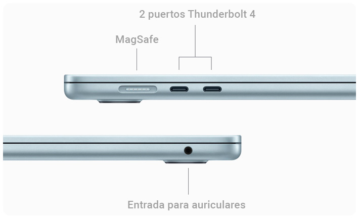 - El cable de carga MagSafe viene con imanes que se conectan y desconectan fácilmente para evitar que tu MacBook Air salga volando por accidente. Dos puertos Thunderbolt 4 te permiten conectar accesorios de alta velocidad y cargar tu Mac. La entrada para auriculares es compatible con modelos de alta impedancia. Y el WiFi 6E es hasta 2 veces más rápido que el WiFi 6.