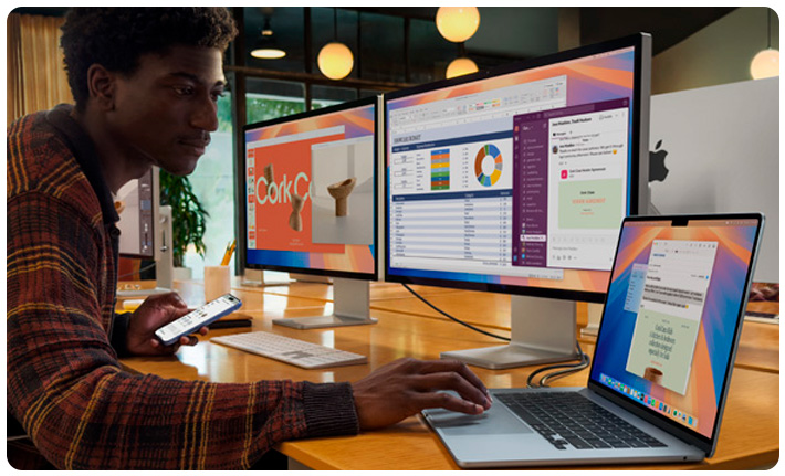 Convertí tu MacBook Air en el espacio de trabajo perfecto conectando hasta dos monitores externos. Te vendrá de maravilla cuando tengas que trabajar en varios documentos o apps a la vez.