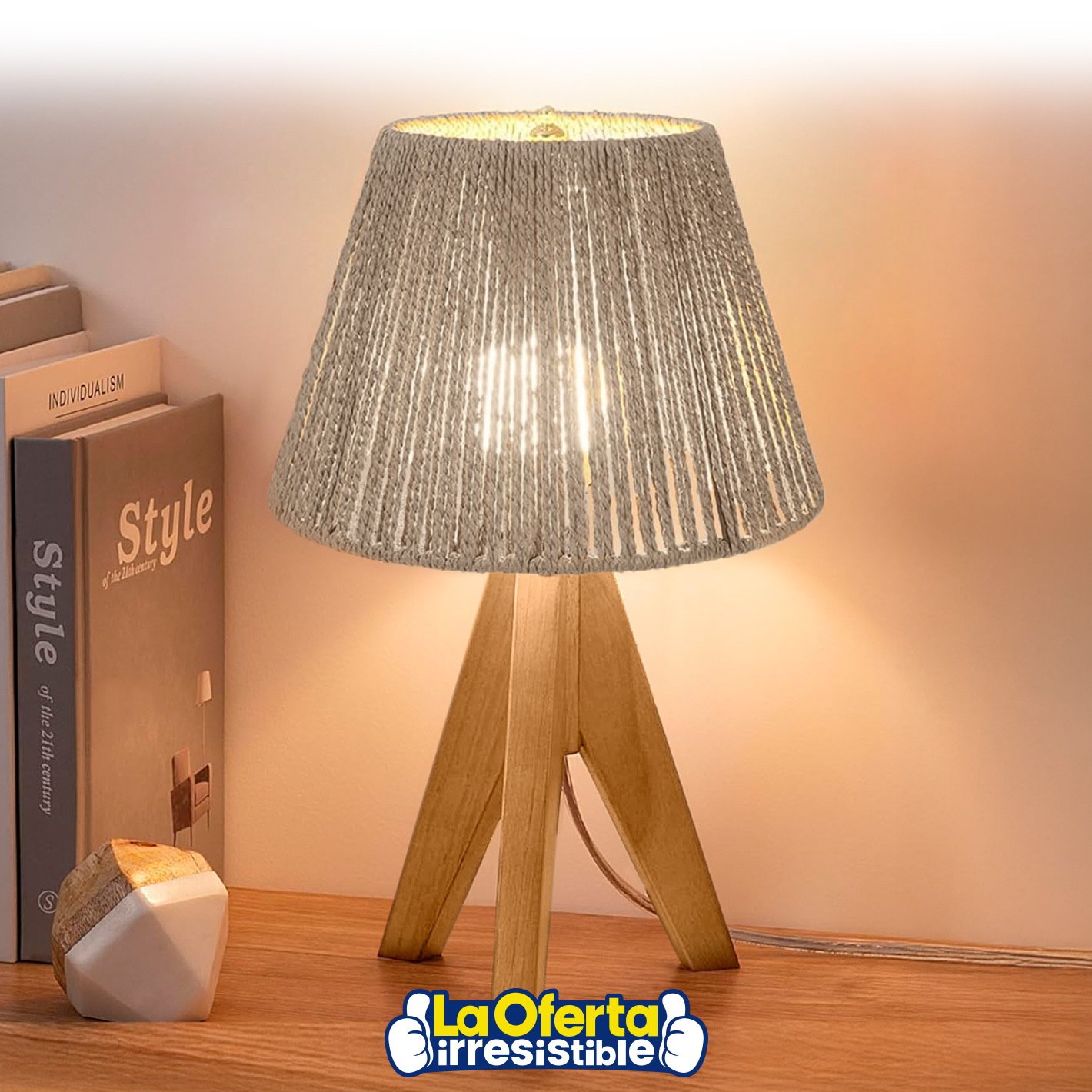 • Este producto: Lámpara Portátil de Mesa con Patas de Madera y Pantalla de Cuerda Sisal, Rosca E27 - Caqui - $ 749