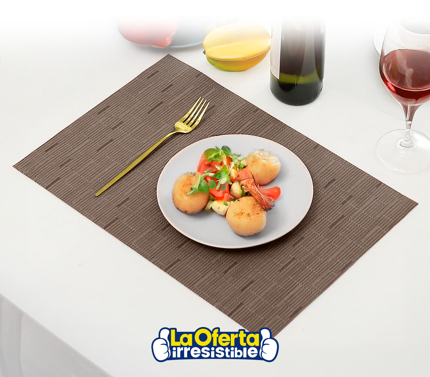 Este set de 4 individuales rectangulares es ideal para dar un toque de elegancia y funcionalidad a tu mesa. Están fabricados con una innovadora mezcla de PVC y poliéster que ofrece gran resistencia, flexibilidad y una larga vida útil. Su diseño de doble cara, con bordes termosellados y un acabado fino, realza cualquier espacio, mientras que la superficie antideslizante y resistente a las manchas facilita su limpieza diaria. Se pueden mantener impecables con solo un paño húmedo o una esponja, y gracias a su formato flexible, se pliegan fácilmente para guardarlos sin ocupar lugar. Además, su resistencia al calor los convierte en una opción práctica, duradera y versátil, perfecta para el uso diario en el hogar.