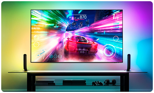 - Creá un ambiente dinámico con luces inteligentes que se sincronizan con tu contenido. Los televisores Samsung analizan los colores y movimientos de la pantalla y envían una señal a las luces Hue para conseguir el mismo efecto, lo que se traduce en una experiencia visual increíblemente envolvente.