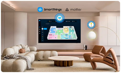 - Con un concentrador inteligente integrado, tu televisor puede conectar y controlar dispositivos inteligentes, incluso aquellos compatibles con Matter y HCA. También podés recibir notificaciones sobre tus dispositivos directamente desde la pantalla, incluyendo una vista de mapa 3D que muestra todo el sistema de tu hogar inteligente de un vistazo.